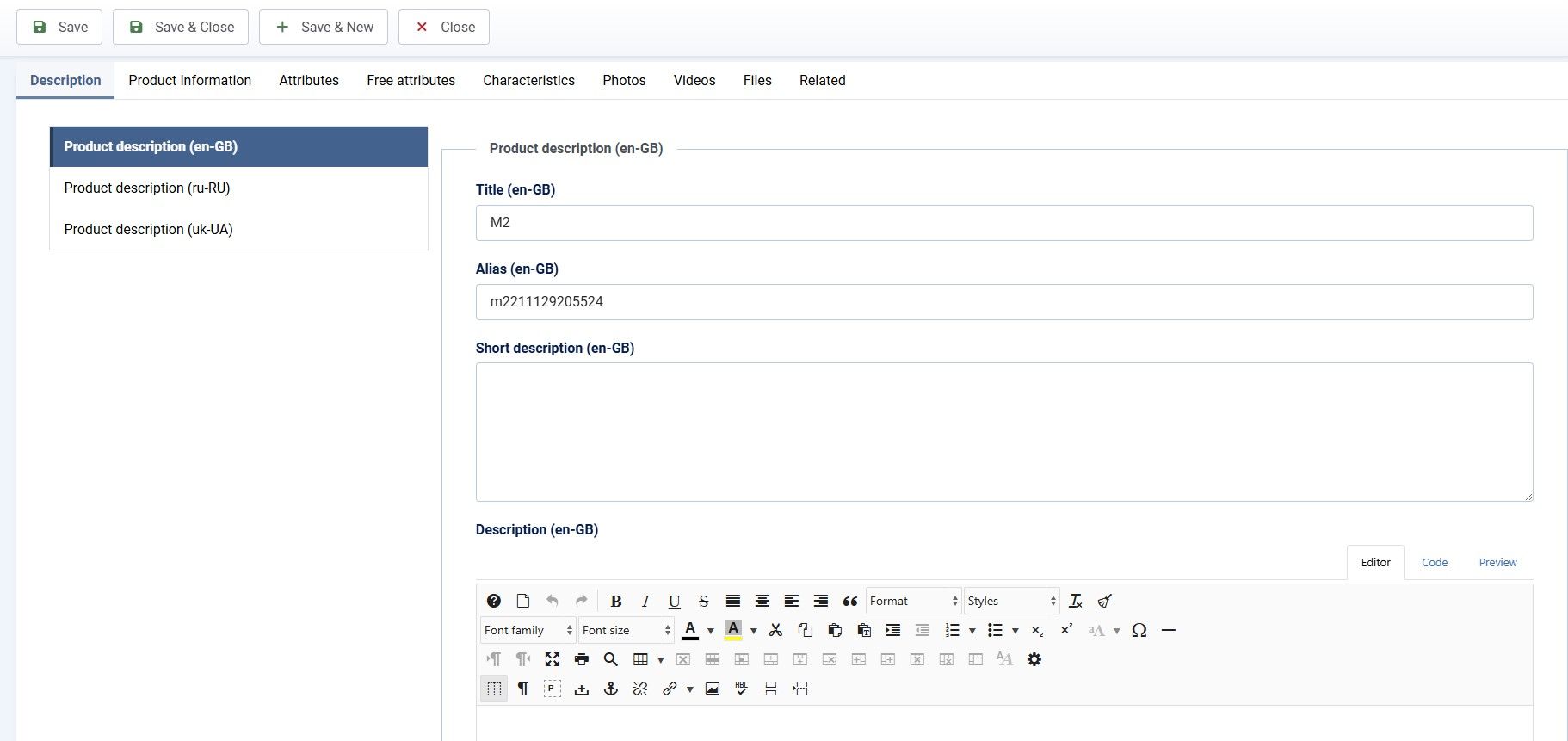 - Вкладка "Описание" — при заполнении описания товара слева отображается плавающий блок языковых переключателей, позволяющий быстро менять язык для заполнения основной информации: названия, описаний, метатегов.