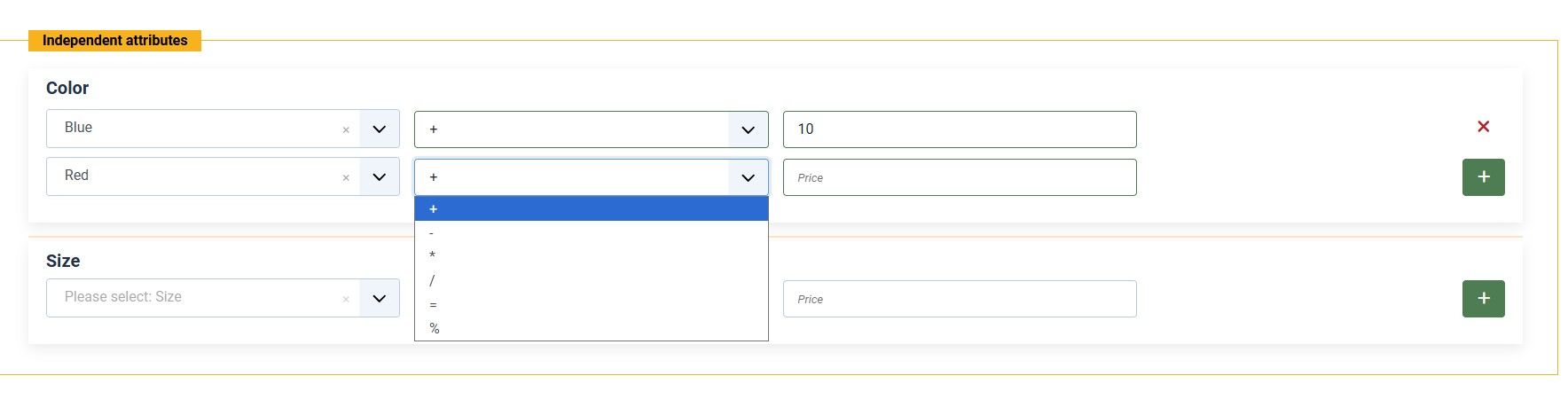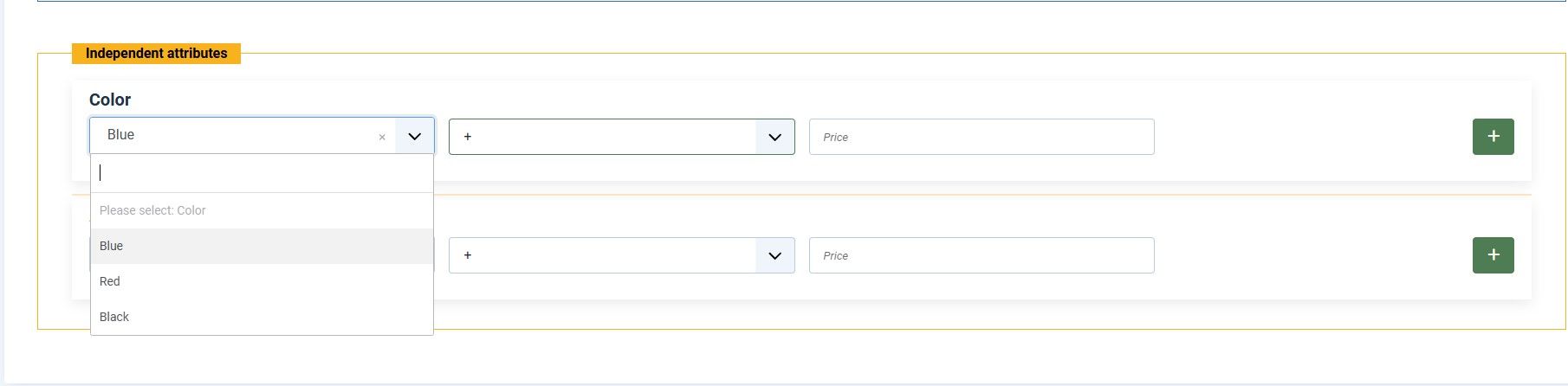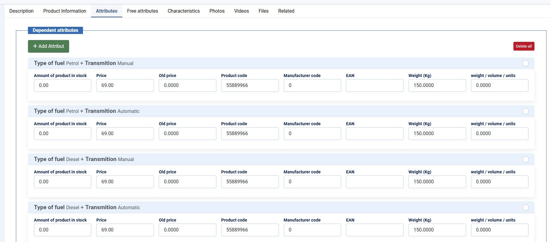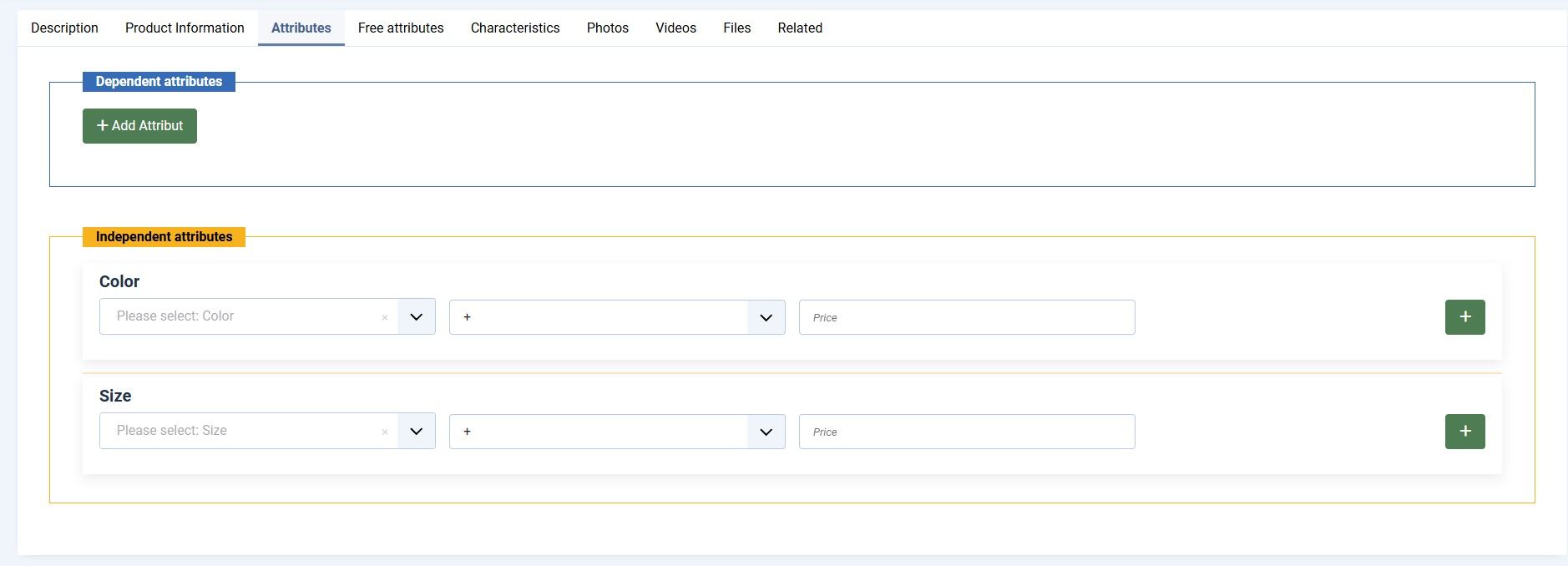 - Вкладка "Атрибуты" — позволяет быстро добавлять зависимые атрибуты (один-ко-многим или многие-ко-многим). Каждая связка атрибутов отображается отдельным блоком с наглядными полями для заполнения. Если создана только часть связок, остальные атрибуты не мешают выбору — доступны только те, которые можно назначить. Также есть возможность создавать независимые атрибуты или изменять существующие без удаления.