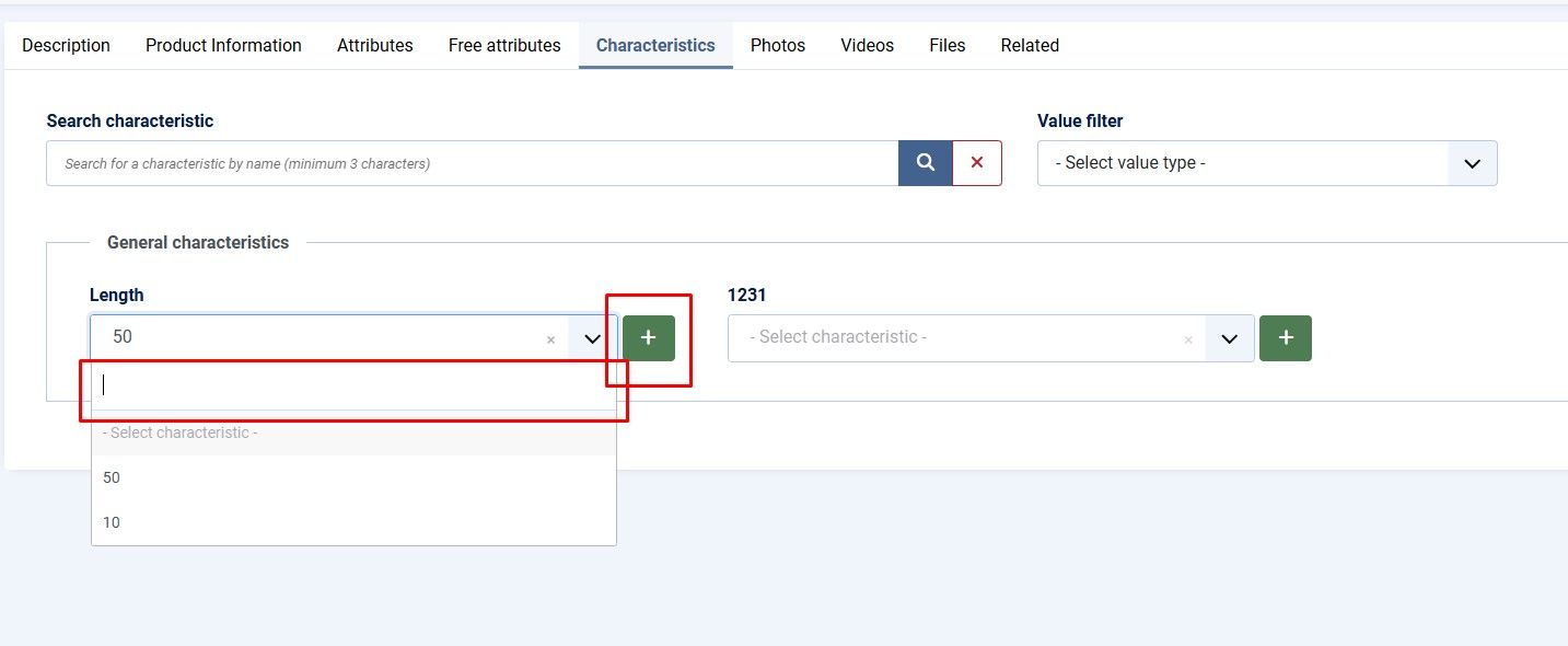 - Вкладка "Характеристики" — позволяет удобно выбирать или добавлять опции характеристик. Используются два основных типа: множественный выбор и уникальный текст. Остальные варианты вписываются в эту логику, что оптимизирует БД. Доступен удобный поиск и фильтрация по группам или заполненности. Новая характеристика автоматически назначается товару.