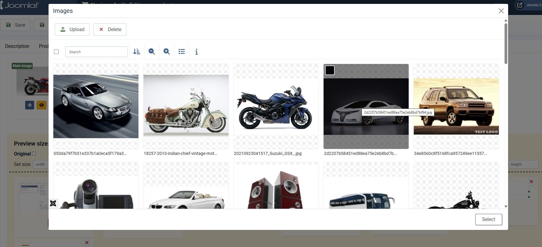 - Вкладка "Фото" — позволяет массово добавлять изображения (без ограничений по количеству) методом Drag & Drop. Поддерживается выбор из MediaManager Joomla со всеми его возможностями. Порядок изображений можно менять простым перетаскиванием.