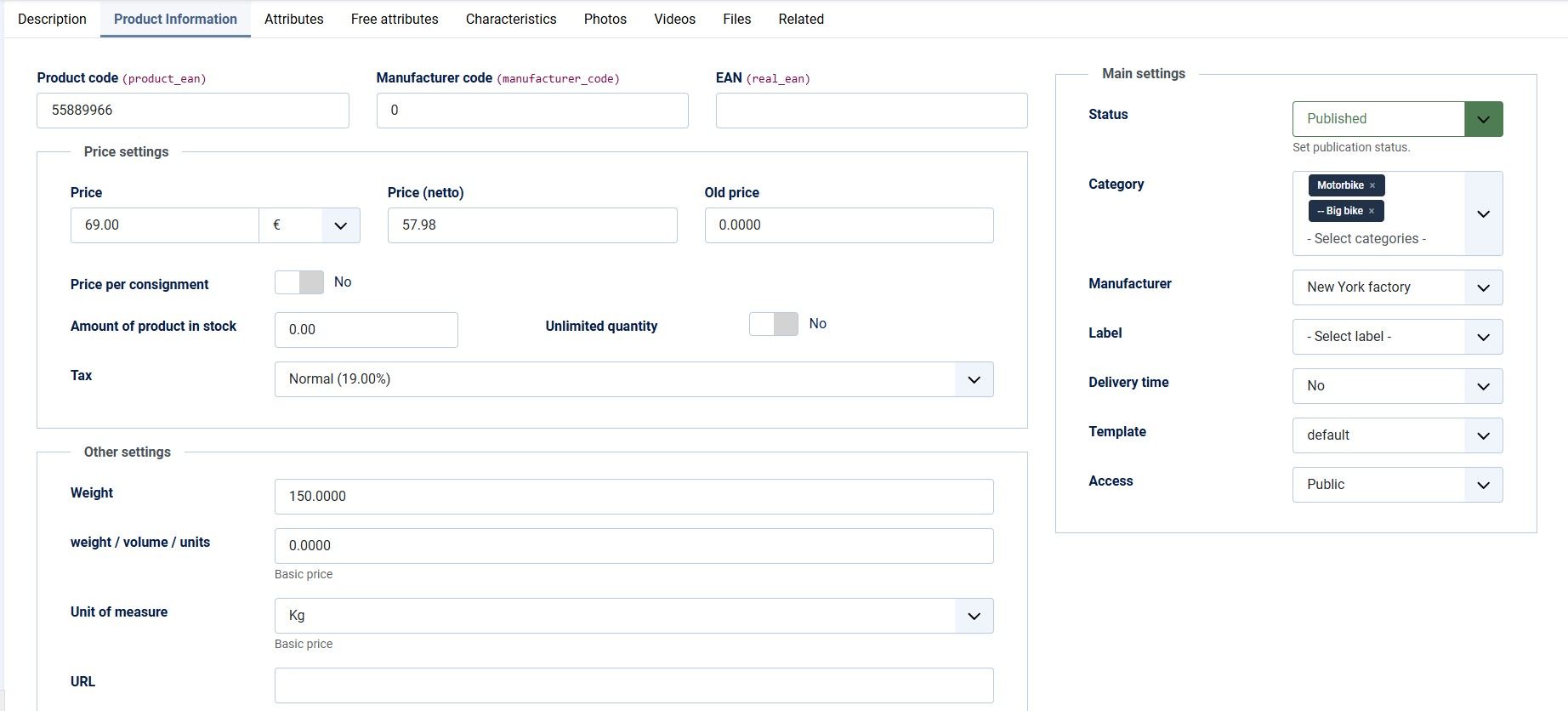 - Вкладка "Информация о товаре" — обеспечивает удобное и каноничное для Joomla предоставление информации, что позволяет быстро заполнить все необходимые поля.