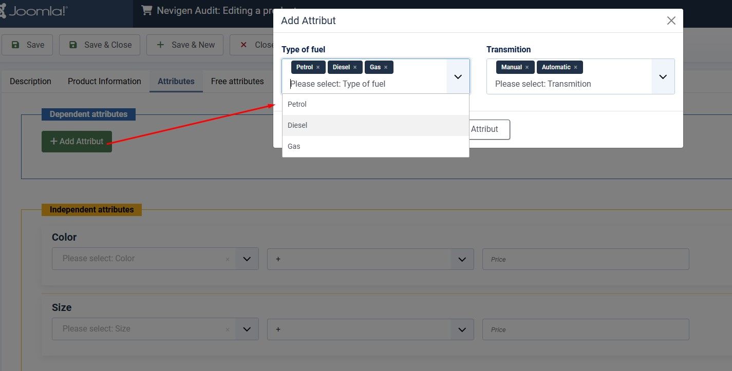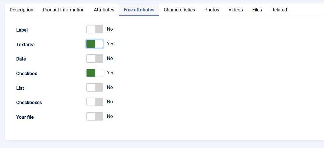 - Вкладка "Свободные атрибуты" — обеспечивает стандартный для Joomla способ отображения переключателей для выбора свободных атрибутов в товаре.