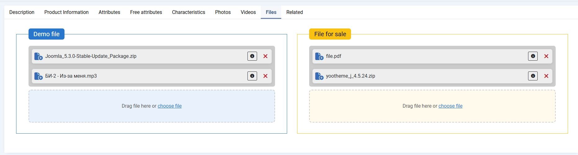 - Вкладка "Файлы" — позволяет добавлять файлы для продажи или демо-файлы, доступные для скачивания пользователем. Разрешенные форматы и типы задаются в настройках Joomla и JoomShopping.